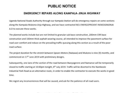 Uganda UNRA Starts Construction of Kampala, Mukono-Jinja Highway The Uganda National Roads Authority (UNRA) on Monday closed one lane of the Kampala-Mukono-Jinja highway ...